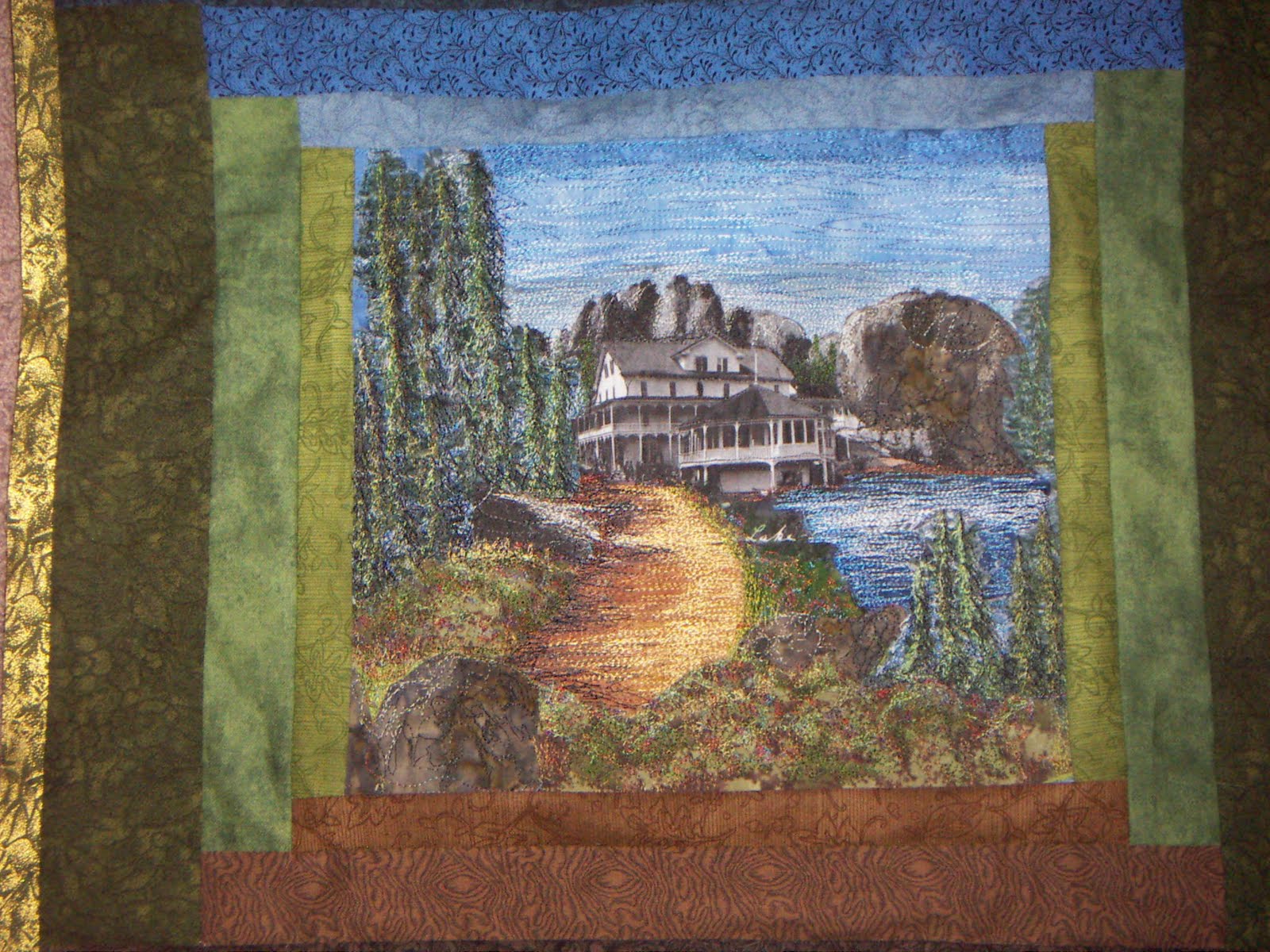 I have collected lots of lovely vintage glass plate negatives and film negatives. I have a scanner that can turn the negatives into positives. The first images I worked with were images of the Black Hills of SD taken in the 1920's. I selected about a half dozed of the negatives and worked with them via photoshop and then had the fabric printed at Spoonflower. This first series is black and white. The images on the fabric can be colored lightly with crayon and heat set. The resulting subtle coloring brings to mind the old hand tinted photos. I experimented with one image to see how well I could intergrate it into the art quilt. The image I chose is one of the old Sylvan Lake Lodge in Custer State Park, SD. The above photo shows the first sample. There a couple of other photos that show some of the varieyt of image and size that I have been experimenting with.